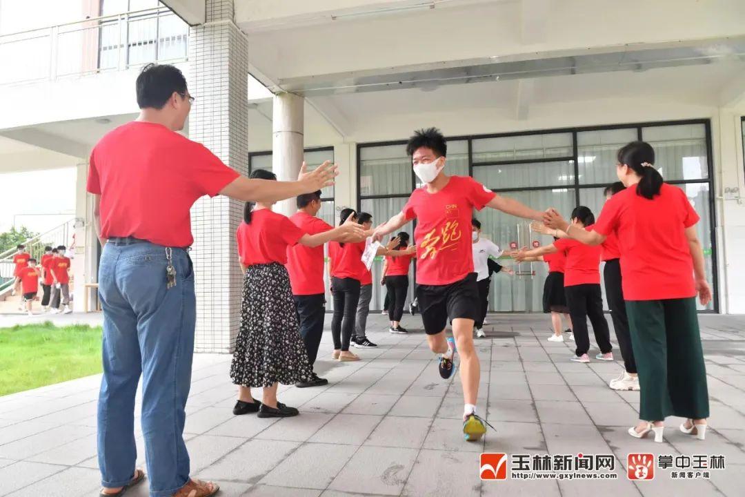 “加油,必胜!”8时10分,记者在玉林市第十中学(玉林高中南校区)看到,考生在进入考场前,一一跟走廊两旁的老师击掌鼓劲,他们意气风发,精气神十足,迈着矫健的步伐,走向教学楼的考场,有序排队进行第一次安检。