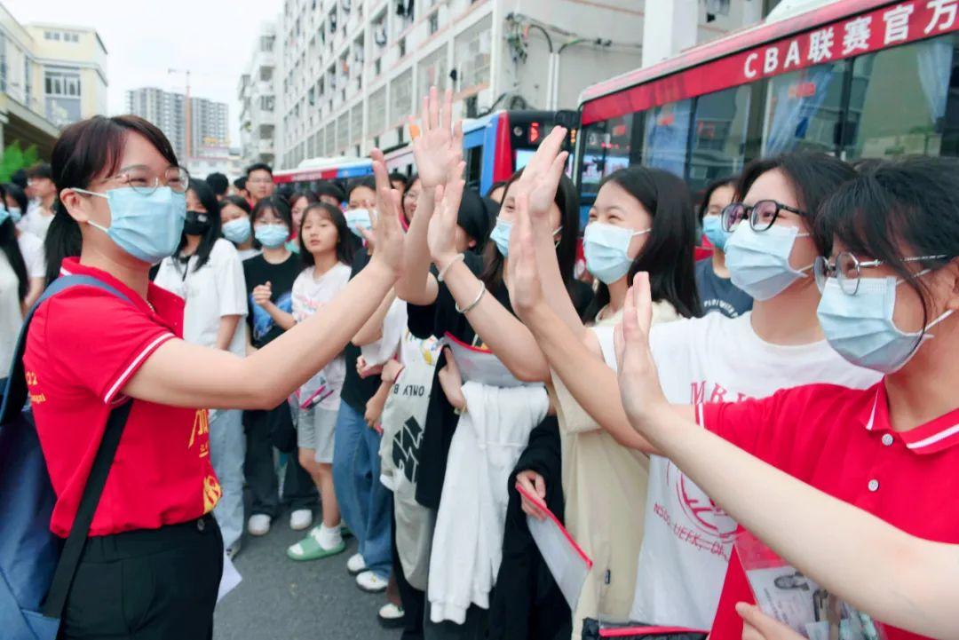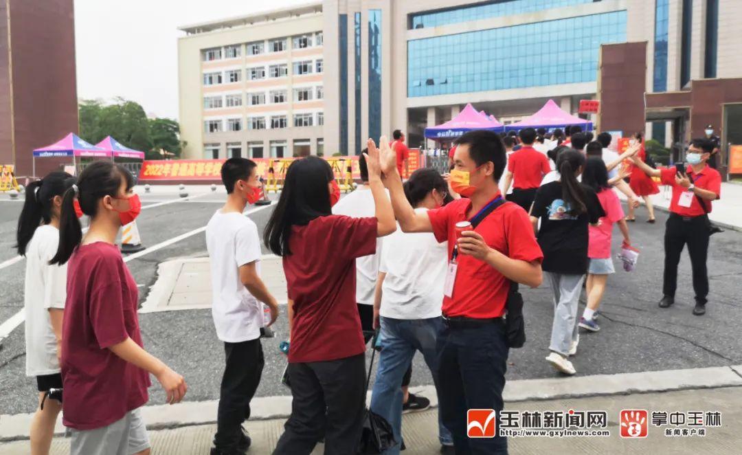 6月7日上午,玉林高中考点,带队老师与学生击掌为其加油鼓励。