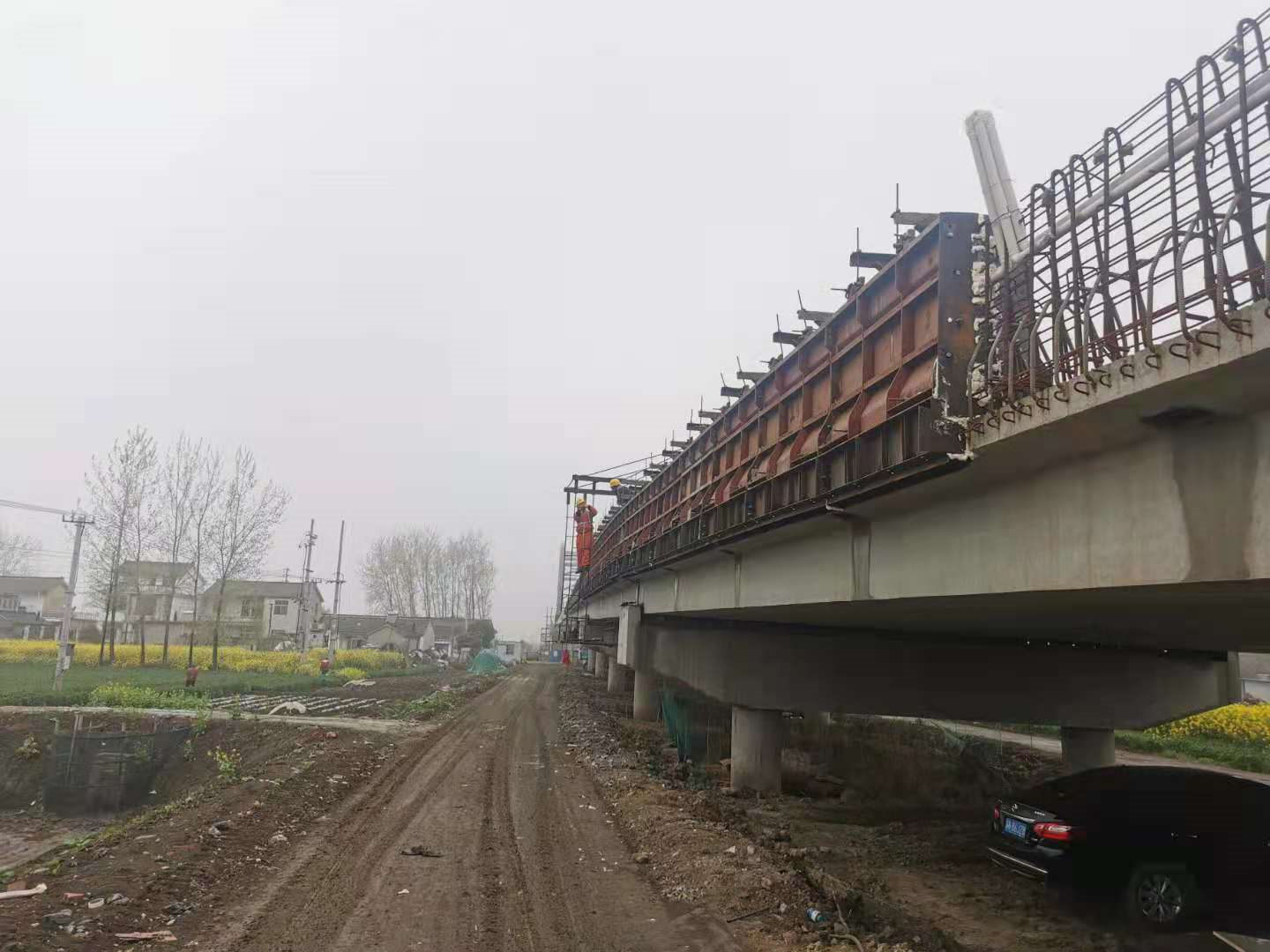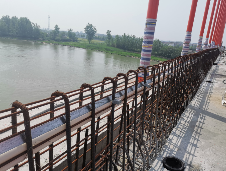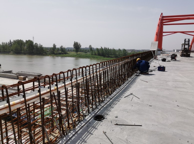 钢筋安装前先对梁面进行清理,凿除浮渣、浮浆并用水冲洗干净。然后根据放样数据拉线定位钢筋安装的位置及高程。按照图纸要求,钢筋采用绑扎连接,按照桥规有关要求进行质量控制。施工时特别要注意控制好钢筋顶面高程以及线形。