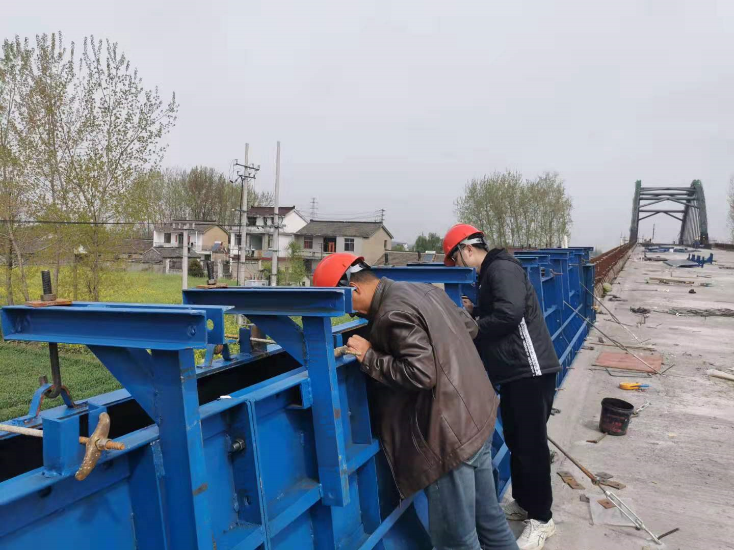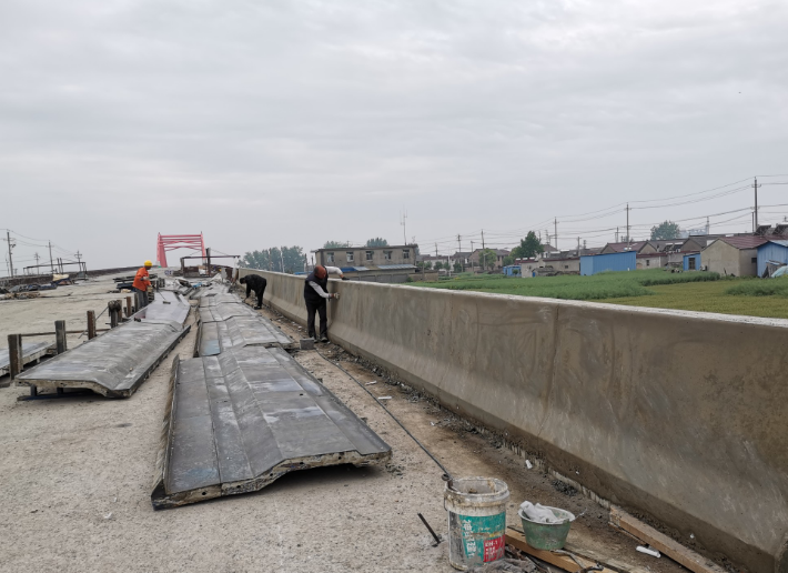 (2)模板安装,顺序为先内侧后外侧。安装时,可先依据已弹出的尺寸边线进行对位。对好后,用临时支撑固定好模板,再粗略调整好内侧模板后,同理安装外侧模板。待内外侧模板都装完后,应进行模板垂直度和线形的精确调整,直至符合规范要求。护栏模板安装完成后,务必对护栏模板顶面标高和垂直度进行标高复测,以保证模板的线型满足要求。