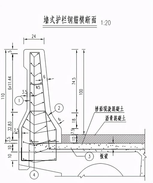 (1)钢筋成形采用钢筋成形设备在钢筋场内进行,成形时严格按施工图纸尺寸对接长钢筋接头打弯、对箍筋进行弯曲。防撞护栏钢筋布置图如下所示:
