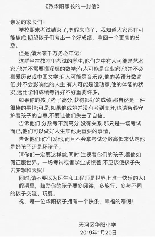 我们先一起看看去年广州一家学校在期末考试后致家长的一封信,以下是信件的全文: