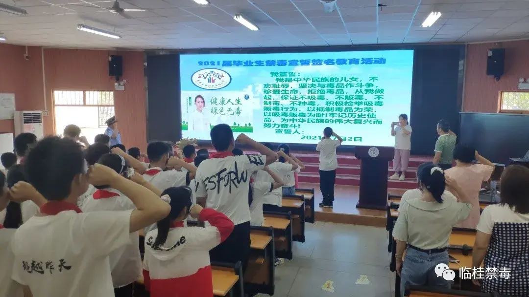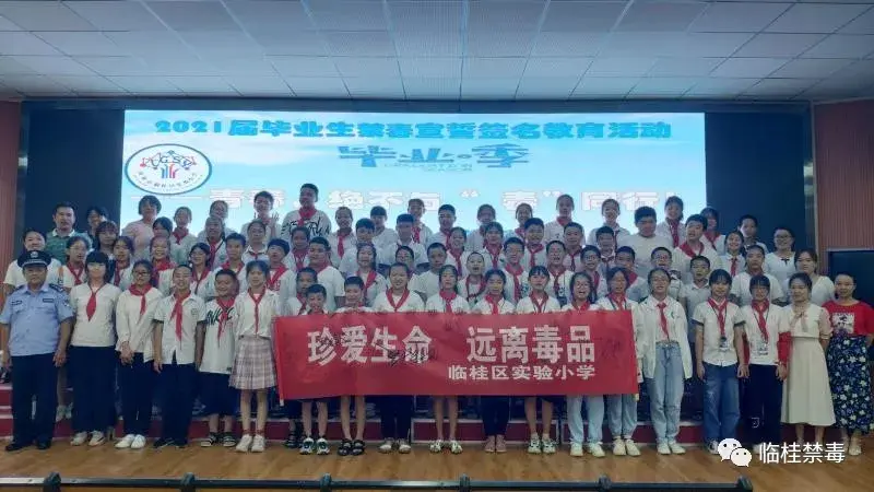 临桂区实验小学开展了以“青春,绝不与‘毒’同行!”为主题的2021届毕业生禁毒宣誓签名教育活动。