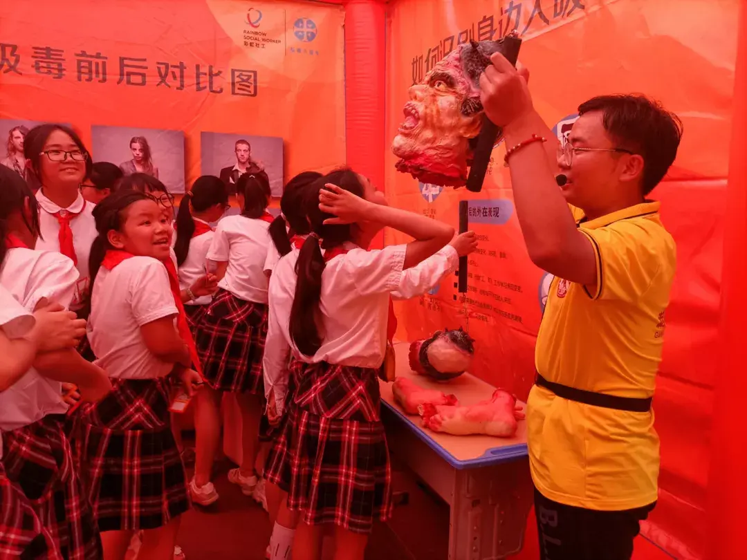 通过灯光、视效、声音等多样化感官效应,从听、说、看、体验四个维度让同学们零距离认识了解毒品,体验其危害。