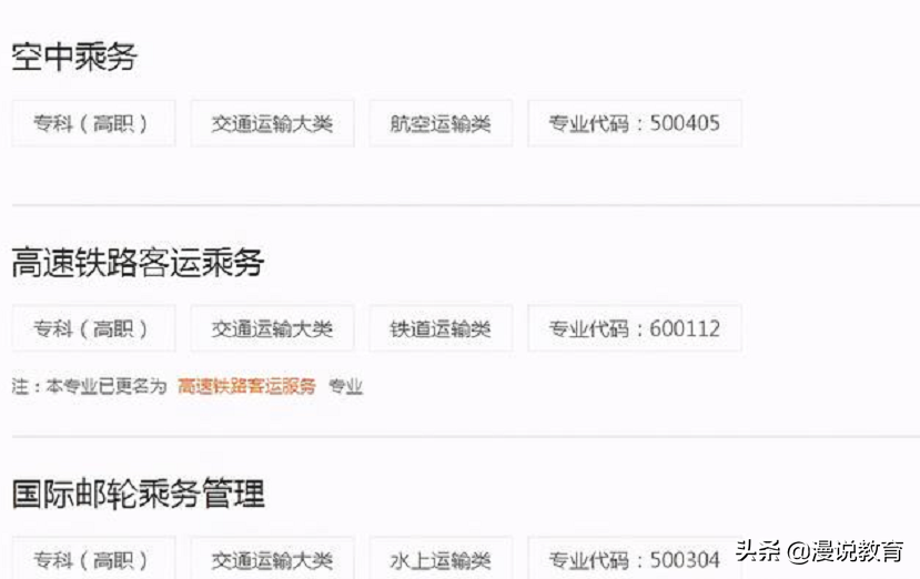近些年来,很多高校开设了乘务专业,比如空中乘务、高速铁路客运乘务、国际物邮轮乘务管理等专业,并且有一些高校的乘务专业是委培的,毕业就能就业。普通本科高校、专科院校很多都设有乘务专业。