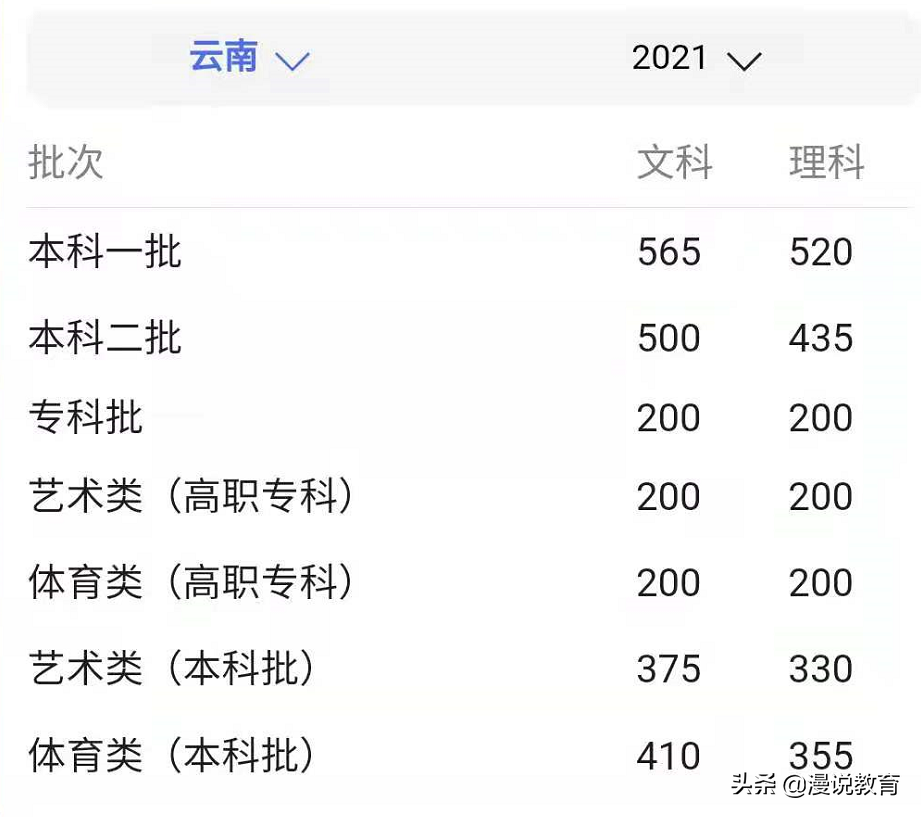 2021年云南文科一本分数线为565分,二本为500分;理科一本分数线为520分,二本为435分。总之都不低,在全国来说,都属于很高的分数线。虽然往年云南的分数线都不低,但是持续高涨的态势,还是增加了考生的压力。