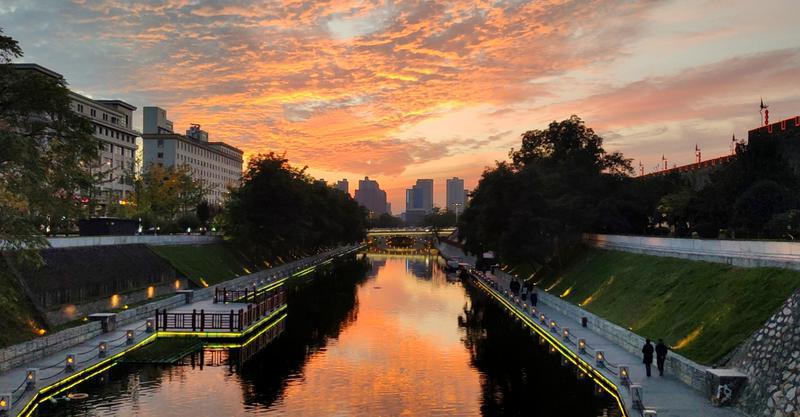 10月21日傍晚,绚丽的火烧云展现在古城西边天际,与城墙和护城河构成一幅绝美的画卷。(记者 李明)