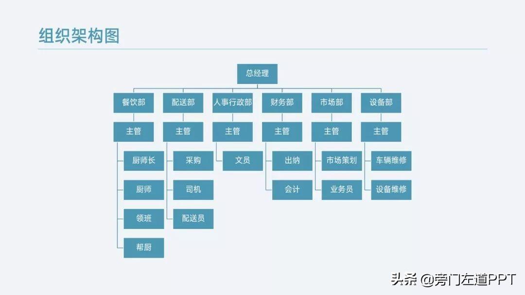 举个例子,大家看下:比如公司介绍 PPT 中都会有的组织架构图。