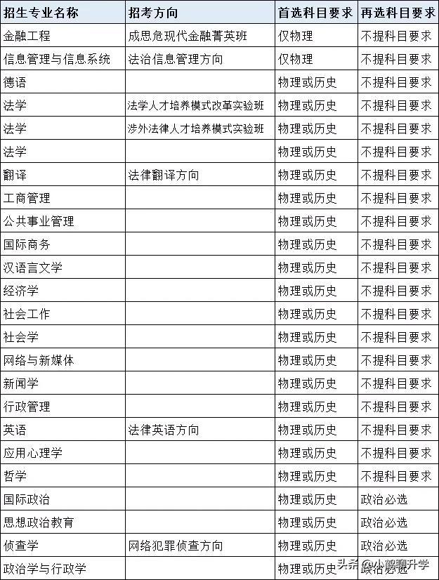 从再选科目要求看,20个专业(类)不提再选科目要求,占全部专业的83%;另外,国际政治、思想政治教育、侦查学、政治学和行政学则要求政治必选。