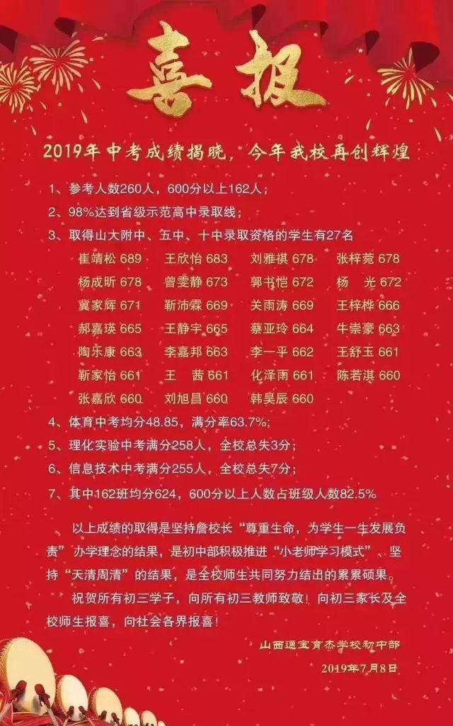2019年太原市中考人数39793人,普高计划26775人,达线比例为67.285%,我校达线比例为88.75%,全市中考均分为512分,我校均分为566分,全市670以上1109人,占中考人数2.786%,我校670以上占比为3.75%,全市650分以上3494人,占比8.78%,我校占比为15%,全市600以上11284人,占比28.36%,我校占比为40.625%,预计605以上将来能达二本线,我校占比为38.75%。