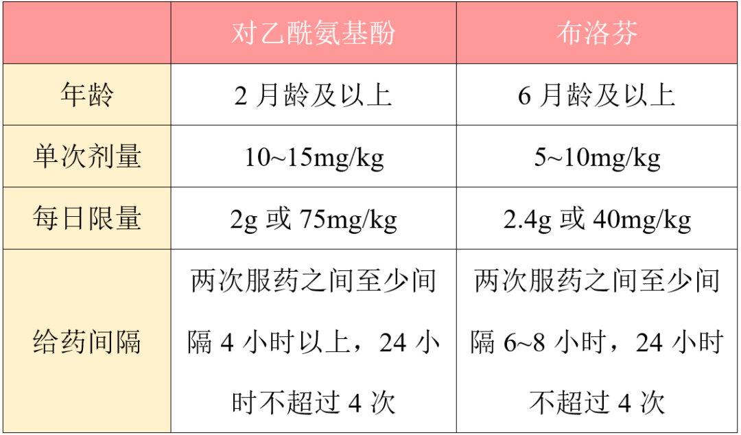 解热镇痛药必要时可重复使用,但需关注用药间隔,对乙酰氨基酚最短间隔时间为 4 h,布洛芬最短间隔 6~8 h,24 h内用药不超过4次。超剂量使用可能会导致严重的肝肾功能损害、胃肠道出血等。