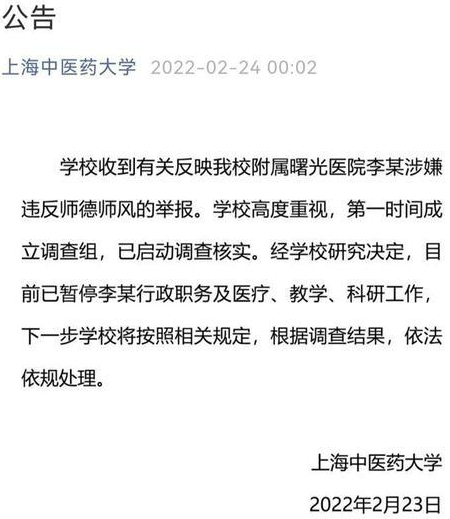 2月24日零点,上海中医药大学发文回应:学校收到有关反映附属曙光医院李某涉嫌违反师德师风的举报。对此,学校高度重视,第一时间成立调查组,已启动调查核实。经学校研究决定,目前已暂停李某行政职务及医疗、教学、科研工作。下一步,学校将按照相关规定,根据调查结果,依法依规处理。