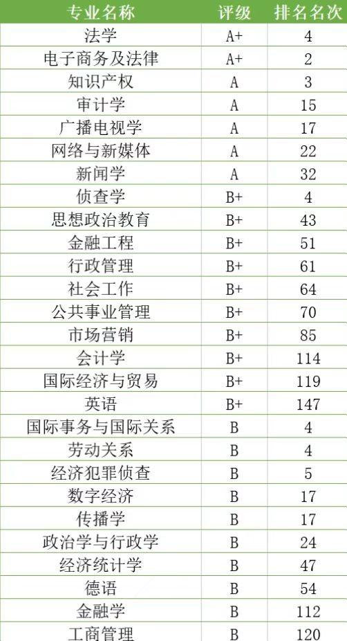2022年6月,“软科中国大学专业排名”公布,西政九成专业强势上榜。其中,法学与电子商务及法律专业获评“A+”专业。知识产权、审计学、广播电视学、网络与新媒体、新闻学等5个专业获评“A”级专业。