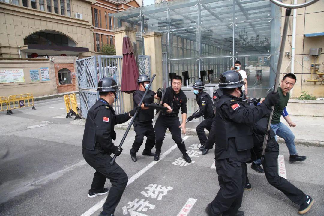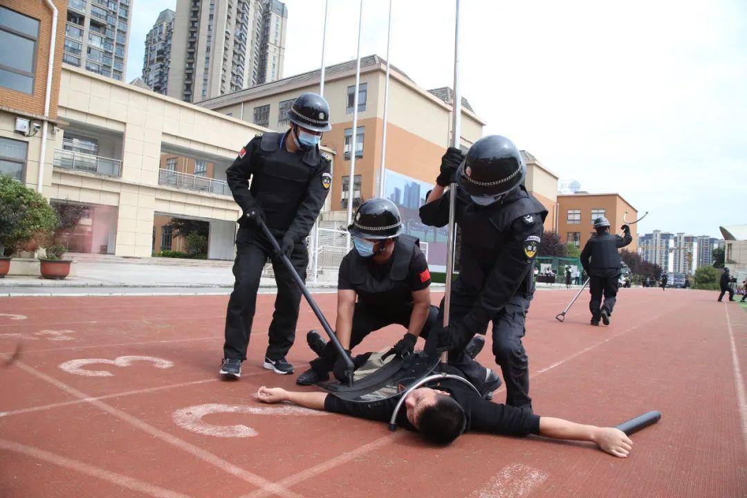 上午10时,演练开始,2名持械“暴徒”强行闯入学校,校园保安人员发现后,立即拉响警报并报警,教师、保安人员手持防暴棍、防爆盾牌与“暴徒”展开周旋,全力保护学生的安全。