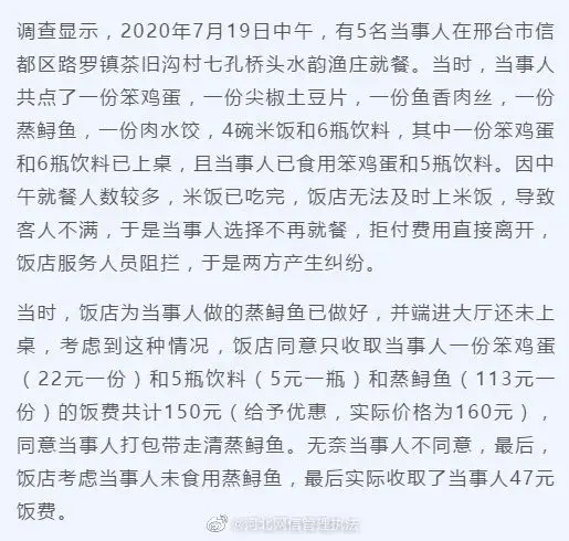 日前,一段配文为“邢台大峡谷,1瓶饮料钱150元”的视频在网上流传,引发网民关注。对此,邢台市信都区市场监督管理局联合信都区文旅局和邢台大峡谷景区对视频反映情况进行了调查。调查结果显示:该事件属餐饮服务纠纷,并非所谓的“1瓶饮料卖150元”,且发生地并非邢台大峡谷景区,而是距离景区15公里处的一家农家乐。视频发布者也并非当事人,系在远处拍摄,未全面了解事情始末的过路者。