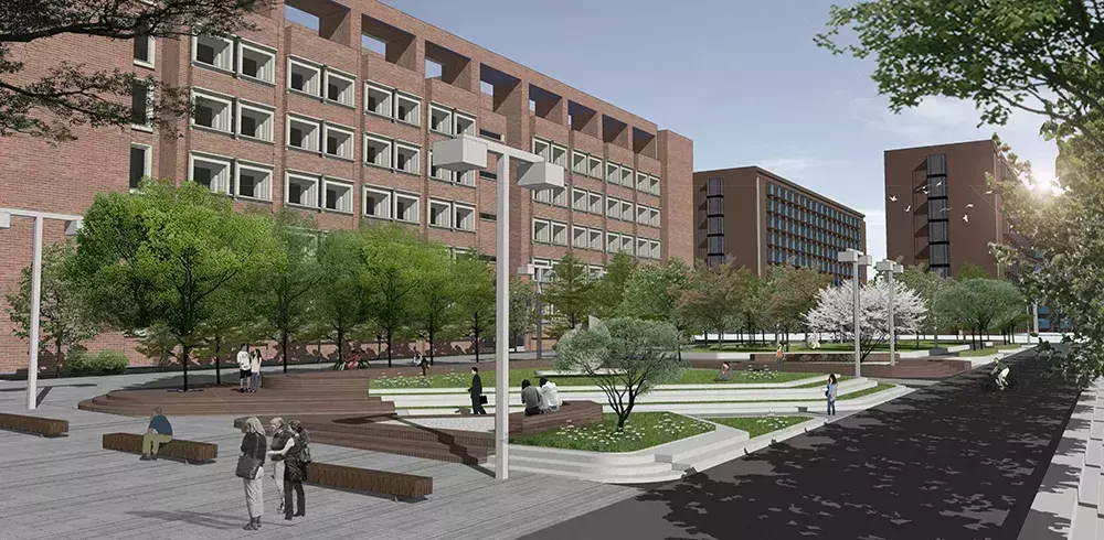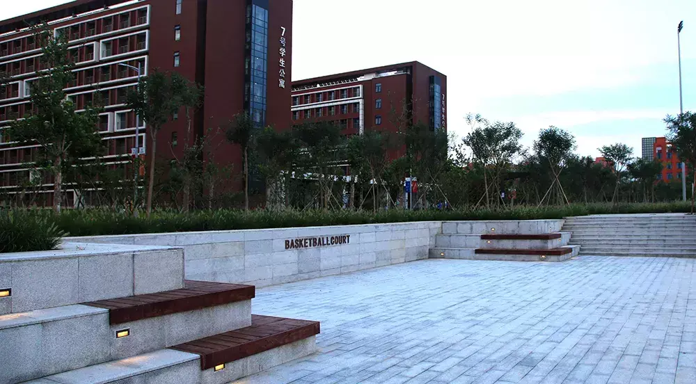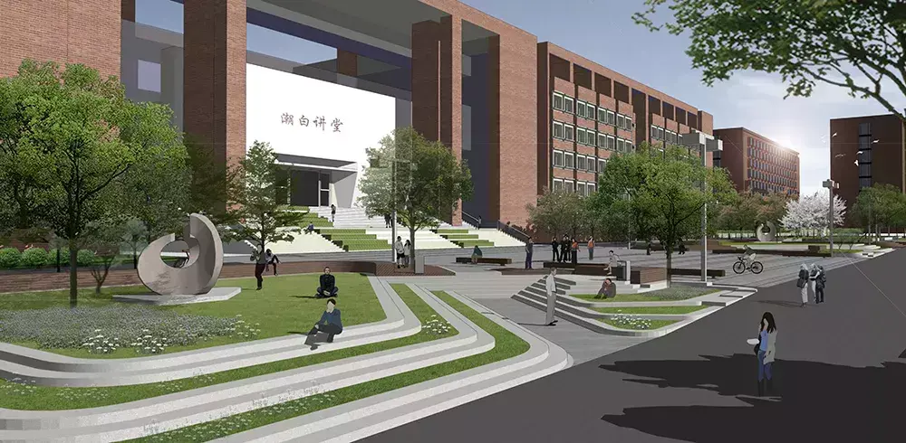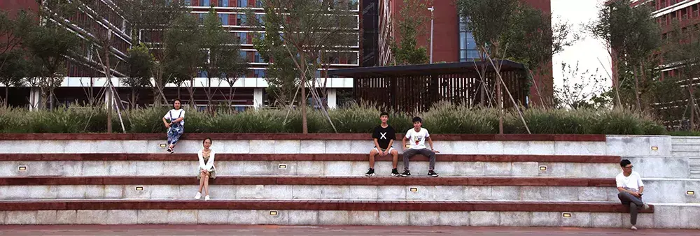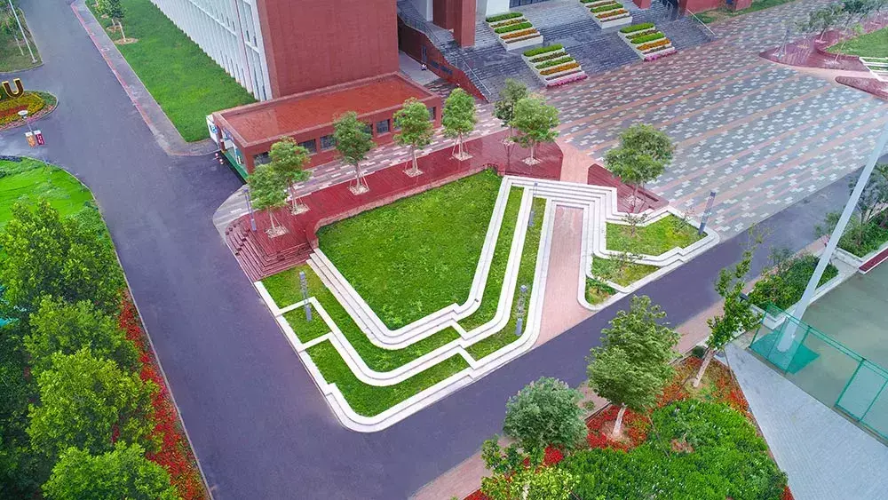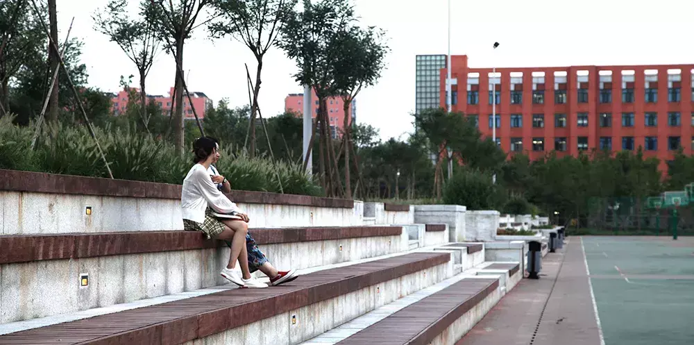 最后来到教学楼北侧现状是几片草坪,团队结合高差将这里变为以广场为核心,兼顾停留、交流、集会等功能的综合性场地。