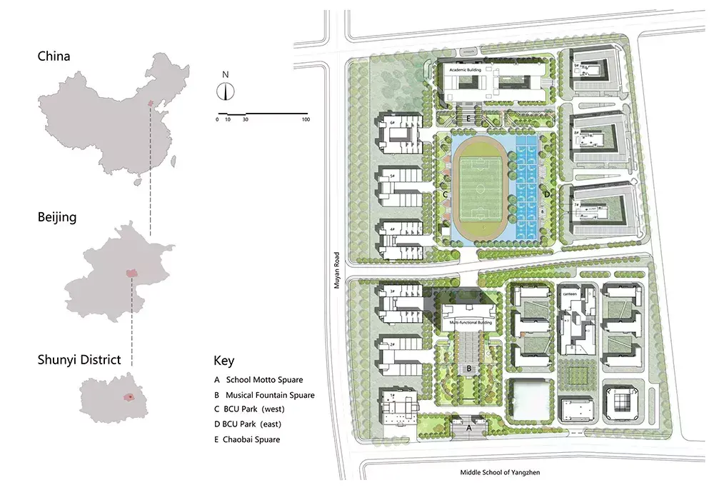 北京城市学院顺义校区位于顺义区杨镇木燕路,为响应北京疏解高校的整体要求,学校率先垂范,以建设“花园式校园”为目标,在已有校园的基础上进行改造和扩建。
