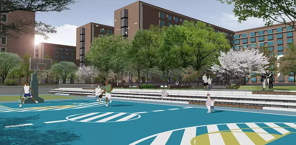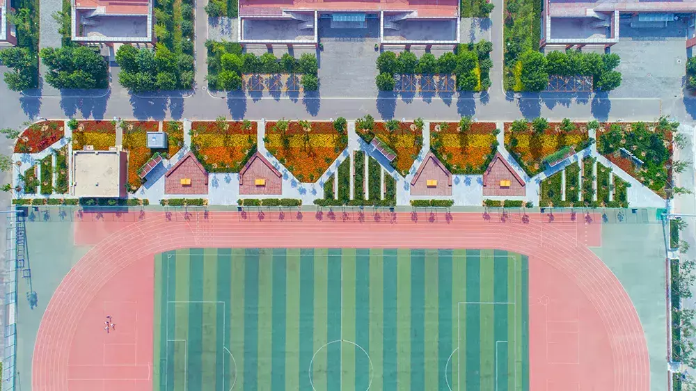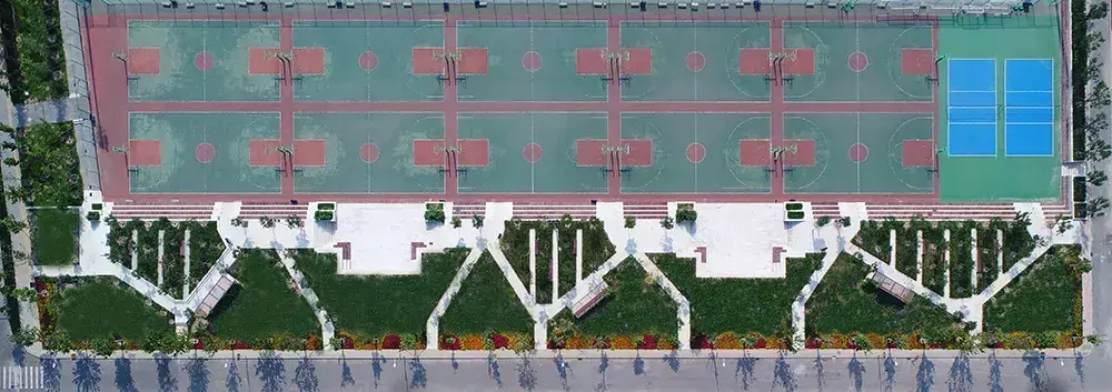 经过综合楼南广场,到达操场区域。操场位于校园中央偏北的位置,且较为封闭,仅开了2座小门。因其特殊的位置原因,团队需要将操场四周的封闭环境打开,满足人群的通行需要。在东侧和西侧注入运动、休闲、交流等空间来充实校园的功能,丰富学生的活动。