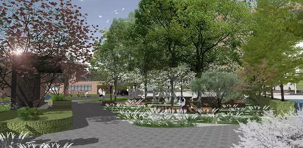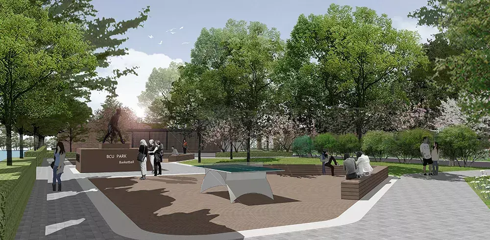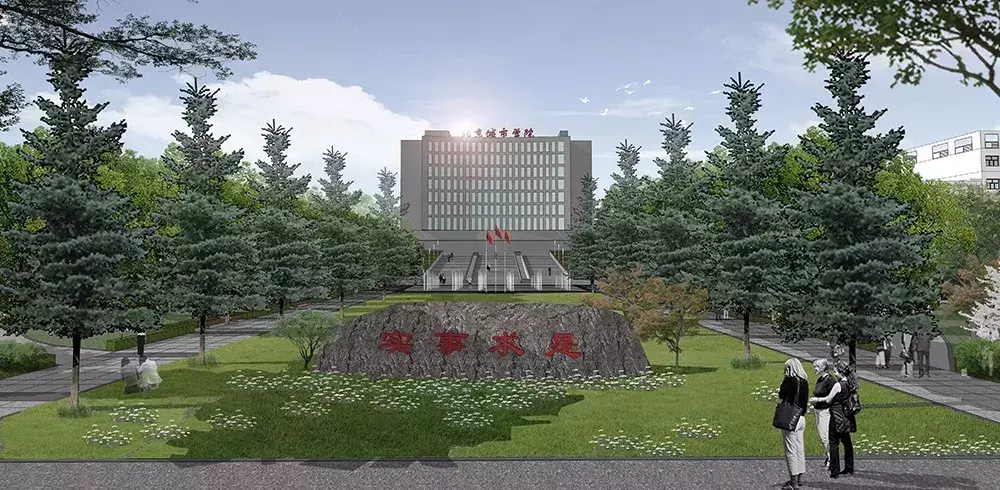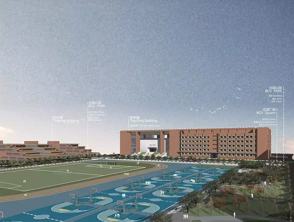 设计团队在尊重场地现状的基础上,希望以校园场所特征为出发点,由单一景观空间走向多种景观空间,形成具有校园特点的集会、文化展示、交流、运动、私密的空间环境,从而达到校园景观空间的重塑。此次提升,设计语言运用几何线性构成,最为关键的是中轴线的设计,形成校训广场、北城音乐广场、北城公园、潮白广场三大空间。建成后丰富了师生的户外活动空间并与之形成互动,结合多种种植方式达到礼仪之美、人文之美、自然之美的校园环境。
