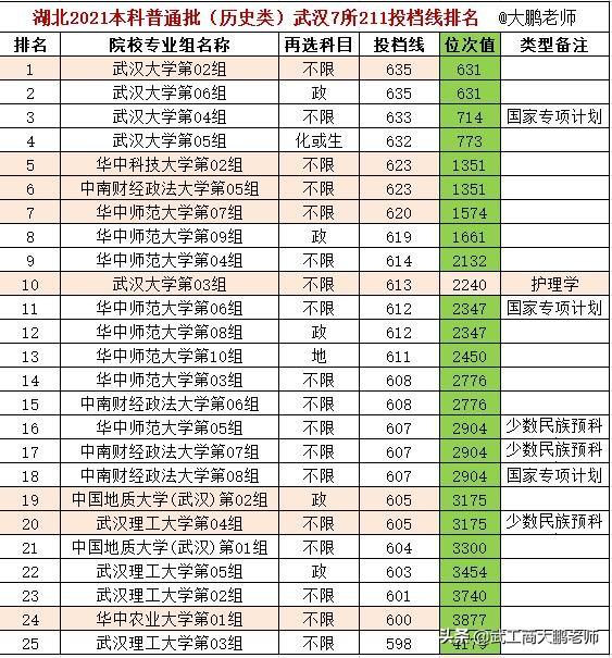 2021年湖北普通本科批次投档线揭晓,大鹏老师根据湖北省招办投档线数据,整理出武汉7所211高校投档分数线对比排名。