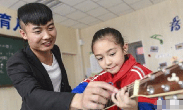 在一间音乐教室中,一位老师正在教小姑娘弹奏吉他,小姑娘是新疆人,从照片中看,她低着头,嘴角微微扬起,学习得非常认真。