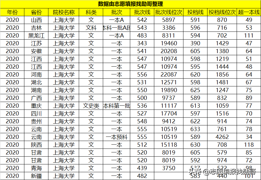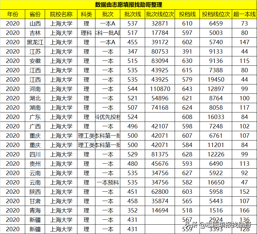 可以看到上海大学在本地招生的录取分数,平均在五百多分的样子,大多数超过一本线30-50分。