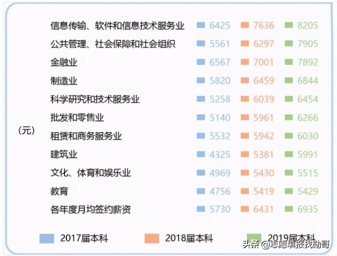 上图是2017-2019 届本科毕业生主要分行业门类的月均签约薪资,三届本科生月均签约薪资较高的 行业:信息传输、软件和信息技术服务业,公共管理、社会保障和社会组织,金融业,制造业。
