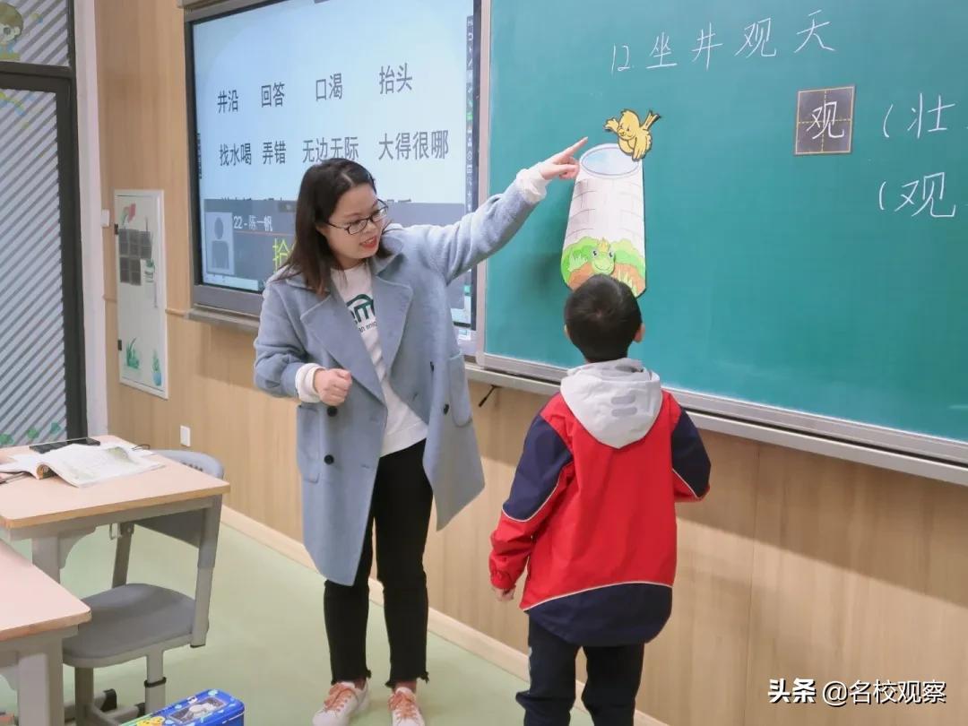 在《坐井观天》的课堂中,孩子们听老师范读、个人自读、同桌互读、男女生轮读再到小组表演读,在琅琅书声中了认识了目光狭窄的青蛙和耐心劝导的小鸟,明白了看问题要有高度、要全面,不能坐井观天的深刻道理。