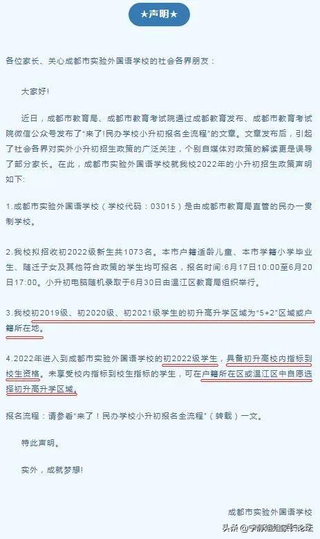 1、实外招生计划和范围由温江区核定,从初2022级(初一)学生起,2025年初升高升学区域将由“5+2”区域调整为温江区。