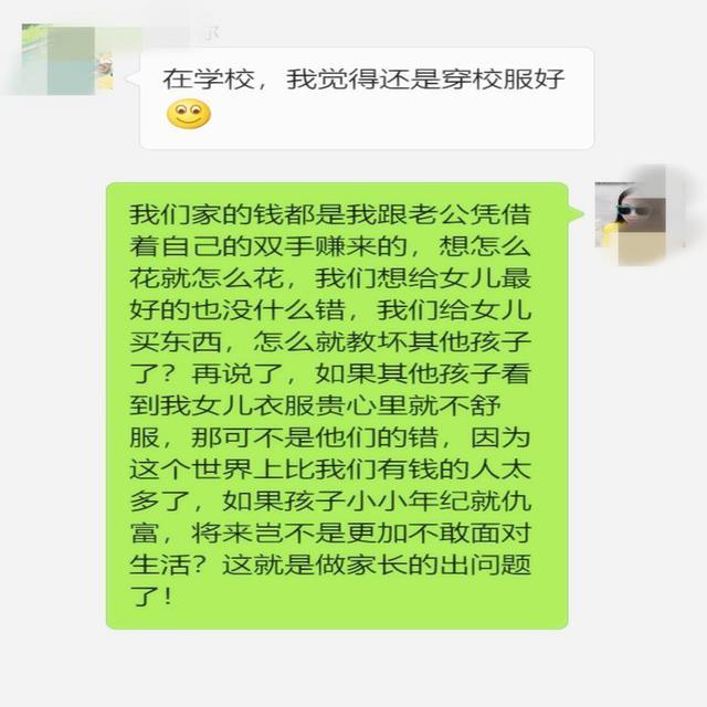 于是赵先生在微信的家长群中,愤怒地质问其他家长:"我想给女儿怎么穿就怎么穿,有些家长也太没素质了,居然就叫自己的孩子歧视别人,这不就是仇富吗?"赵先生这下子发言之后,微信群里瞬间就炸了,一众家长纷纷冒出来,表达自己的不满,"给小孩穿那么贵的衣服,不是几千就是几万,万一和孩子玩耍的时候,不小心把孩子的衣服弄脏弄破了,那不得赔?谁陪得起?"看到有家长这么发言,其他家长也纷纷表示赞同,更有家长腹诽,"要穿好衣服,就去上贵族学校。"