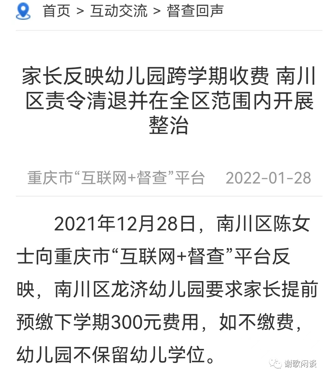今年一月,重庆南川区亦有家长反映幼儿园跨学期收费被责令清退,并以此为戒在全区范围内开展集中整治。
