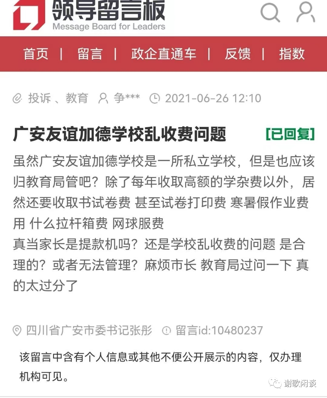 我们注意到,去年(2021),就有网友通过政府官网给市上领导留言,反映广安友谊加德学校存在收取“试卷费”等费用超出了服务性收费和代收费范围的乱收费问题。