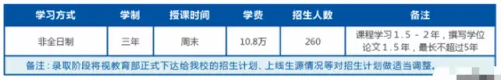 非全日制、周末集中上课,学制2.5年,课程成绩有效期为5年。学费共计12万元人民币(第一学年5万,第二学年5万,最后一学期2万)