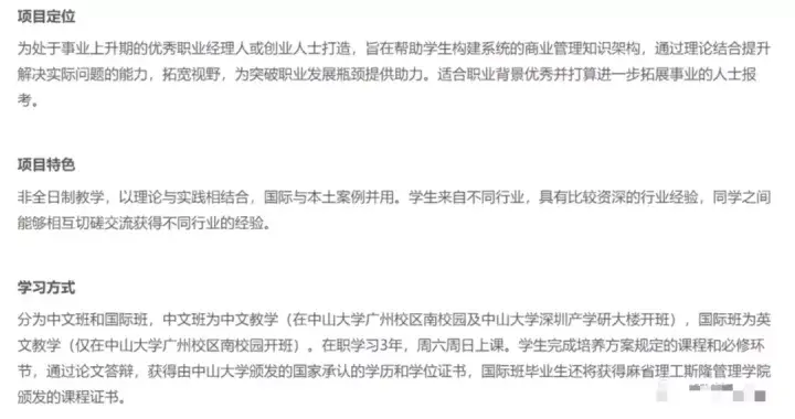 工商管理硕士:非全日制MBA,学制:三年,授课时间为周末,授课语言主要为中文。获得学位:由中山大学颁发相应的、注明学习方式的硕士研究生毕业证书,授予硕士学位。