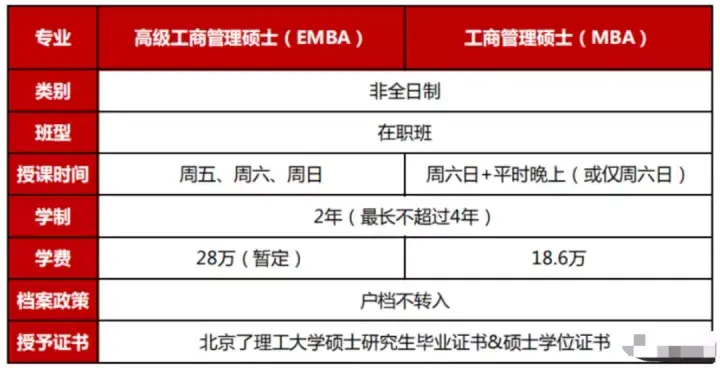 学习方式:集中班:隔周周五、六、日上课;有寒暑假。周末班:每周六、日上课,隔周休一天。有寒暑假。学制:2.5年;颁发证书:研究生学历证书和工商管理硕士学位证书
