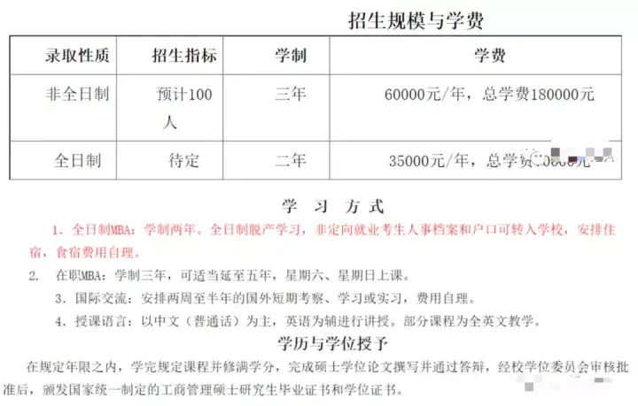 学制:2年,学习方式:必修课安排在周一至周五白天,选修课学生自行选择时间;有寒暑假;颁发证书:研究生学历证书和工商管理硕士学位证书
