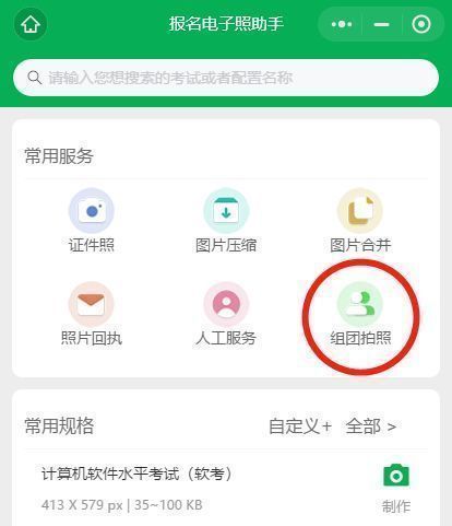 1、打开手机微信客户端,找到【报名电子照助手】程序,选择【组团拍照】功能。
