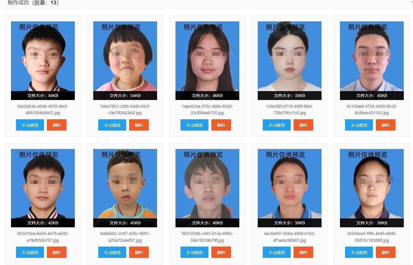 等待每张照片上传完成,就可以看到处理效果了。所有照片都变成了统一的尺寸和蓝色背景,觉得照片裁剪不合适的可以手工调整,也可以替换照片。