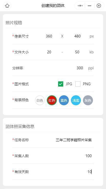 2、填写照片采集任务信息,包括照片尺寸大小、有效期、采集人数等。