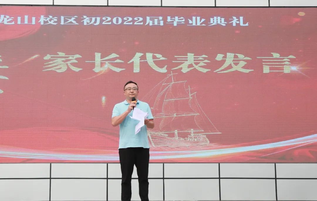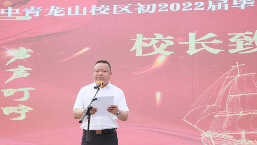 在同学们逐梦远航之前,学校党总支书记、校长韦晗在致辞中向初2022届全体毕业生致以最衷心的祝贺,向帮助孩子成长、培育孩子成才的父母、老师致以最诚挚的敬意。他深情回顾了青龙山校区创办以来的点点滴滴和同学们的三年求学路,肯定了初三学子取得的优异成绩,希望同学们牢记母校的嘱托:一是使命在肩,做明理有志、民族复兴的担当者;二是饮水思源,做胸怀家国、心怀大爱的感恩者;三是追求卓越,做驰而不息、奋楫笃行的领跑者。青春无问西东,奋斗自成芳华。他勉励同学们带着更高更远的梦想再出发。他祝福同学们前程似锦,一路风景,一生芳华。