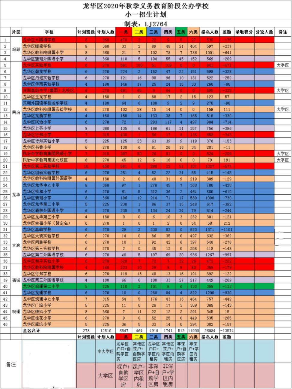 标注红色部分的就是一类,计划招生人数和满足一类条件的人数有明显差距,学位很紧张,有可能会被分流。那红色部分也是属于居住集中区域,这一类校区,相对来说一类饱和度都比较高。大家也可以重点关注一下计划人数跟一类二类三类相匹配的这个数字,看一看自己居住在哪一个地段,比较能上得了学。再看看2020年龙华区积分入学表,根据自己的实际居住情况来匹配。