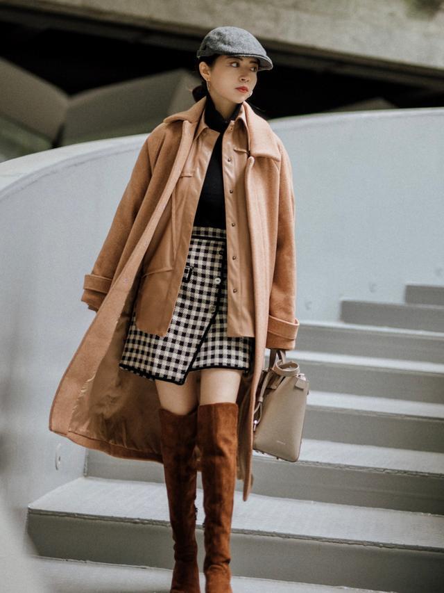 搭配1:大衣+短裙+过膝长靴