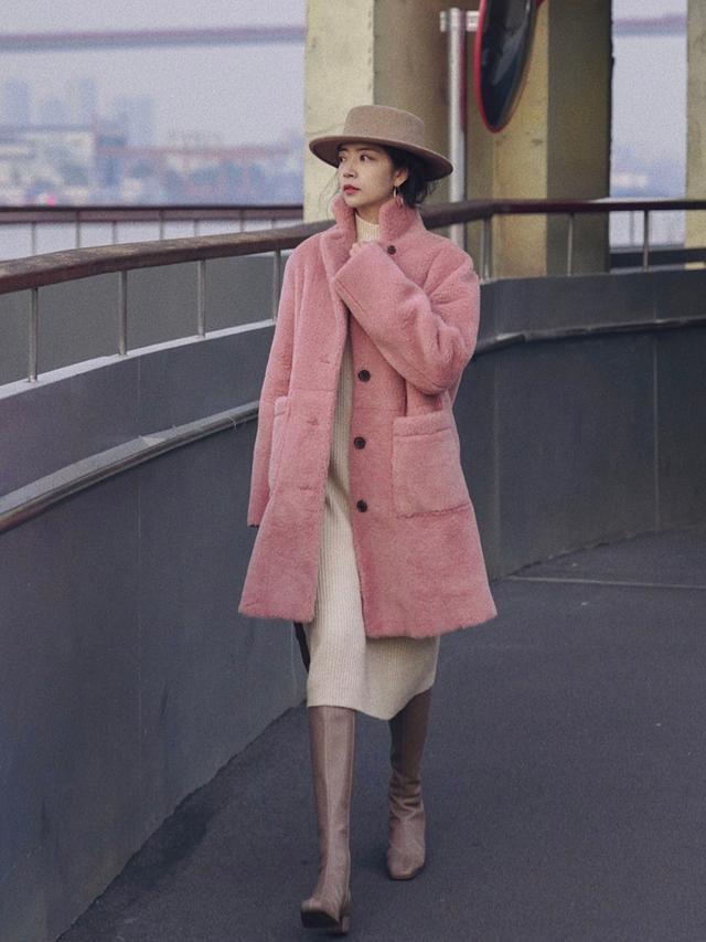 粉色的毛绒大衣,搭配上米色针织连衣裙+咖色长靴,温柔与利落的结合,分分钟打造出娘man平衡的造型感,特别适合知性女人。