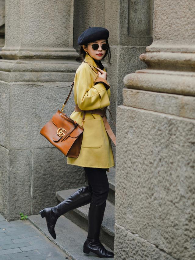 除了能和大衣呼应之外,服装和配饰也能作为鞋子的呼应,比如同色的内搭上衣+长靴、同色的帽子/包包和长靴等等,都能增强造型的和谐感。
