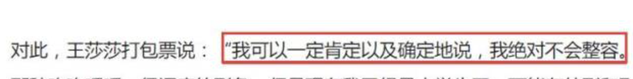 王莎莎坦诚反驳说:“我可以一定肯定以及确定地说,我绝对不会整容,脸是父母给的,不会改变。”