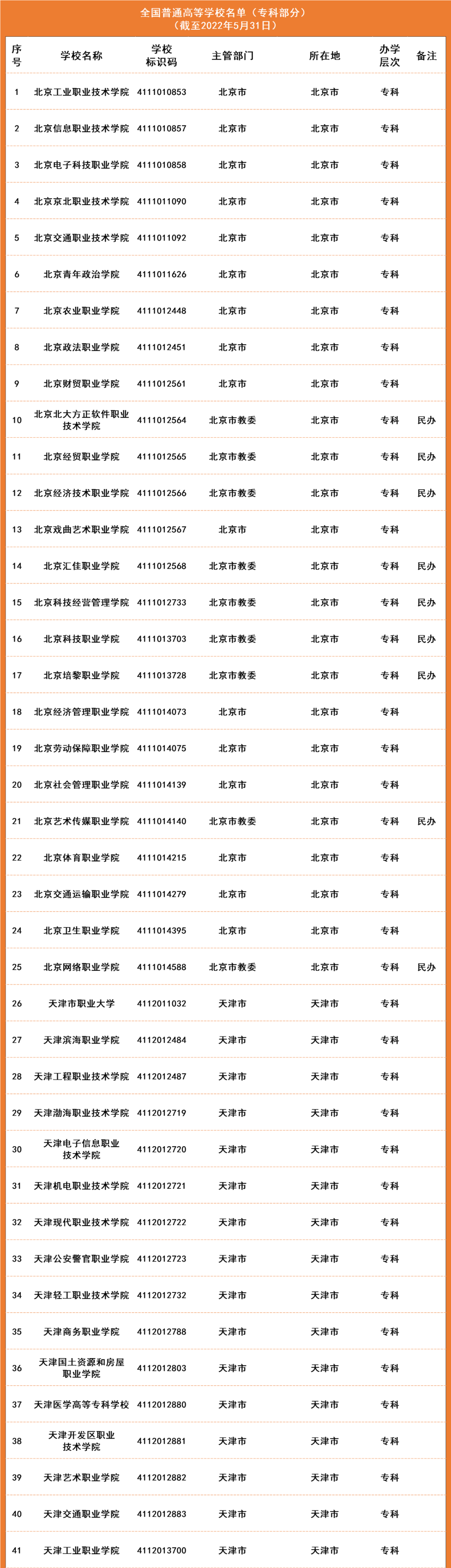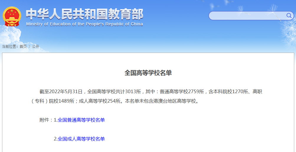 6月17日,教育部发布《全国高等学校名单》,截至2022年5月31日,全国高等学校共计3013所,其中:普通高等学校2759所,含本科院校1270所、高职(专科)院校1489所;成人高等学校254所。本名单未包含港澳台地区的高等学校。一起来看《全国普通高等学校名单》——