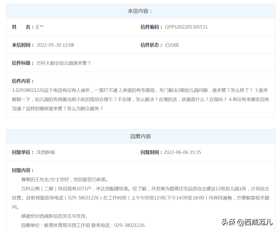 1.02938021226这个电话有没有人接听,一直打不通 2.承诺的有专案组,专门解决2期幼儿园问题,谁来管?怎么样了?3.谁来解释一下,幼儿园的布局跟当前小区的规划合理不?不合理,怎么解决?合理的话,依据是什么?合规吗?4.有没有来跟老百姓沟通?这样的懒政谁来管?怎么为群众服务?