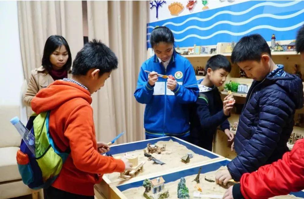 ▲心悦社成员和参观学生、家长玩沙盘游戏。