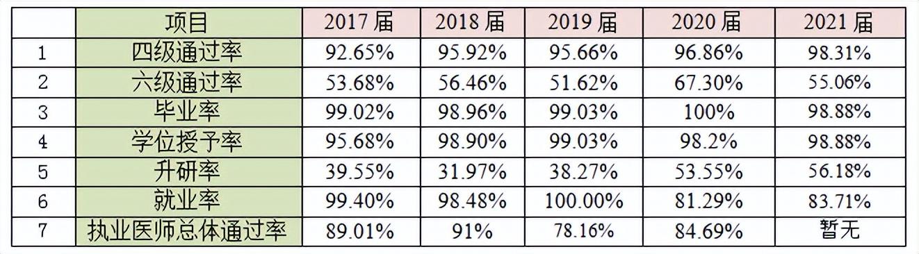 近五年,中医学专业毕业生初次就业率稳步提升;升研率、保研率持良好趋势;四、六级考试成绩优异,在同类医科院校中,名列前茅;毕业生中医类执业医师通过率稳居全国前五;连续三年位居全国第一。