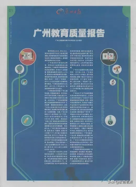 1月10日,《广州日报》全文发布了由广州日报数据和数字化研究院(GDI智库)提供的《广州教育质量报告》,报告围绕广州的基础教育、学前教育、职业教育、高等教育、终身教育以及特殊教育等多领域,反映了广州教育改革的精神,梳理广州教育实践,展示了广州推进教育现代化、建设学习型社会的各项举措及取得成效。